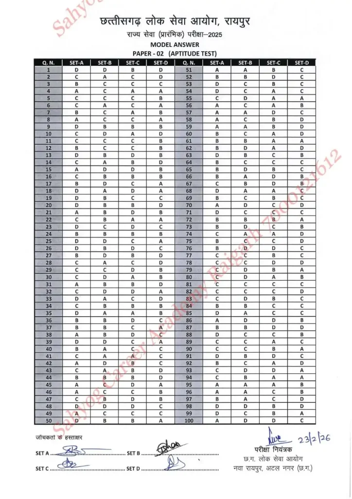 छत्तीसगढ़ लोक सेवा आयोग ( CGPSC ) 2026 का ऑफिशियल मॉडल आंसर आंसर जारी