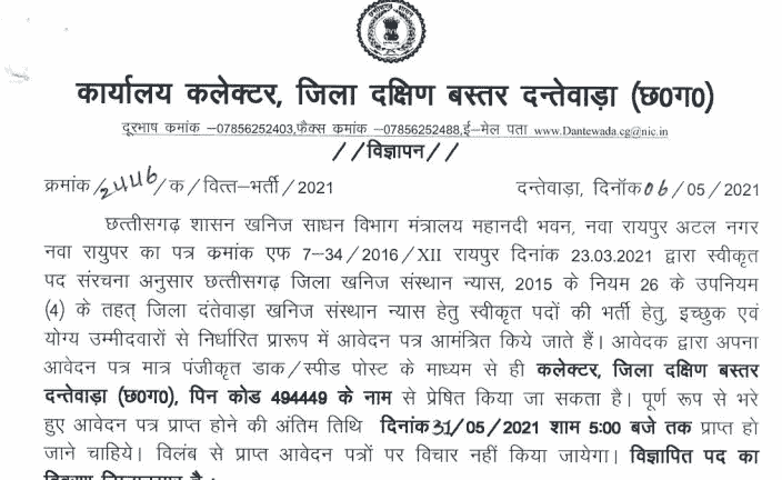 खनिज संस्थान न्यास के अंतर्गत नौकरी पाने का सुनहरा अवसर है, कलेक्टर ऑफिस छत्तीसगढ़ भर्ती 2021 में विभन्न पदों भर्ती के बारें में और अधिक जानकारी जैसे आवेदन कैसे करना है और इसकी आयु सीमा ,वेतनमान ,योग्यता मानदंड,आवेदन शुल्क,महत्वपूर्ण तिथियां ये सब के लिए आप विजिट करें www.cgjobs24.com पर या जिला कलेक्टर कार्यालय दंतेवाड़ा के विभागीय विज्ञापन डाउनलोड कर सकते हैं जो की आपको निचे मिल जायेगा !
